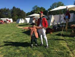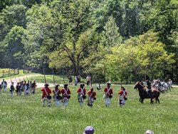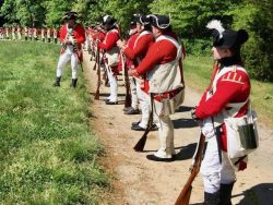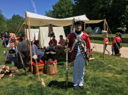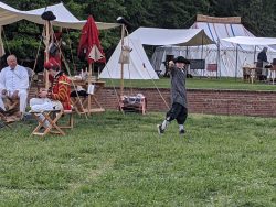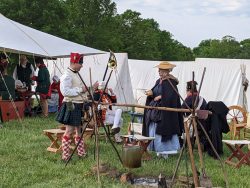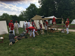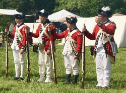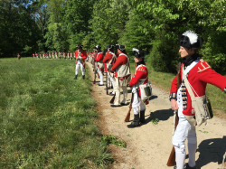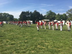 The Crown Forces contained two battalions. The 23rd was brigaded with the 1st New Jersey Volunteers and the (Hessian) Regiment von Hyun (Saturday only). Saturday morning both battalions rehearsed advancing by Indian files, open order, and passing through ranks. There were morning and afternoon scenarios on each day. Mr. Washington was present on the afternoon of each day, which implied a Crown Force defeat or retreat. Jay Weatherbee of the 1NJV commanded the battalion during the Saturday morning battle. The engagement went well and we drove the rebels with minimal resistance.
