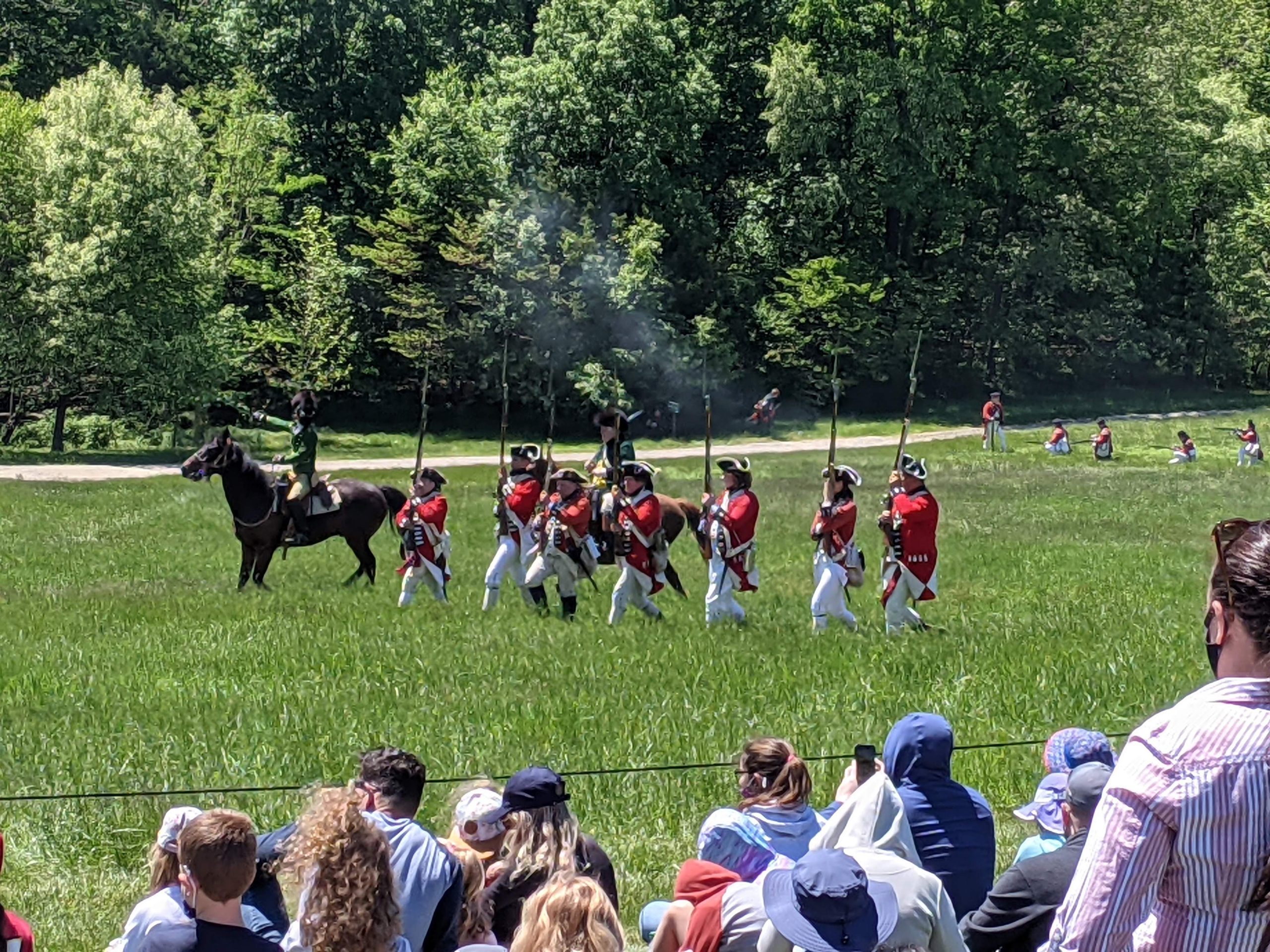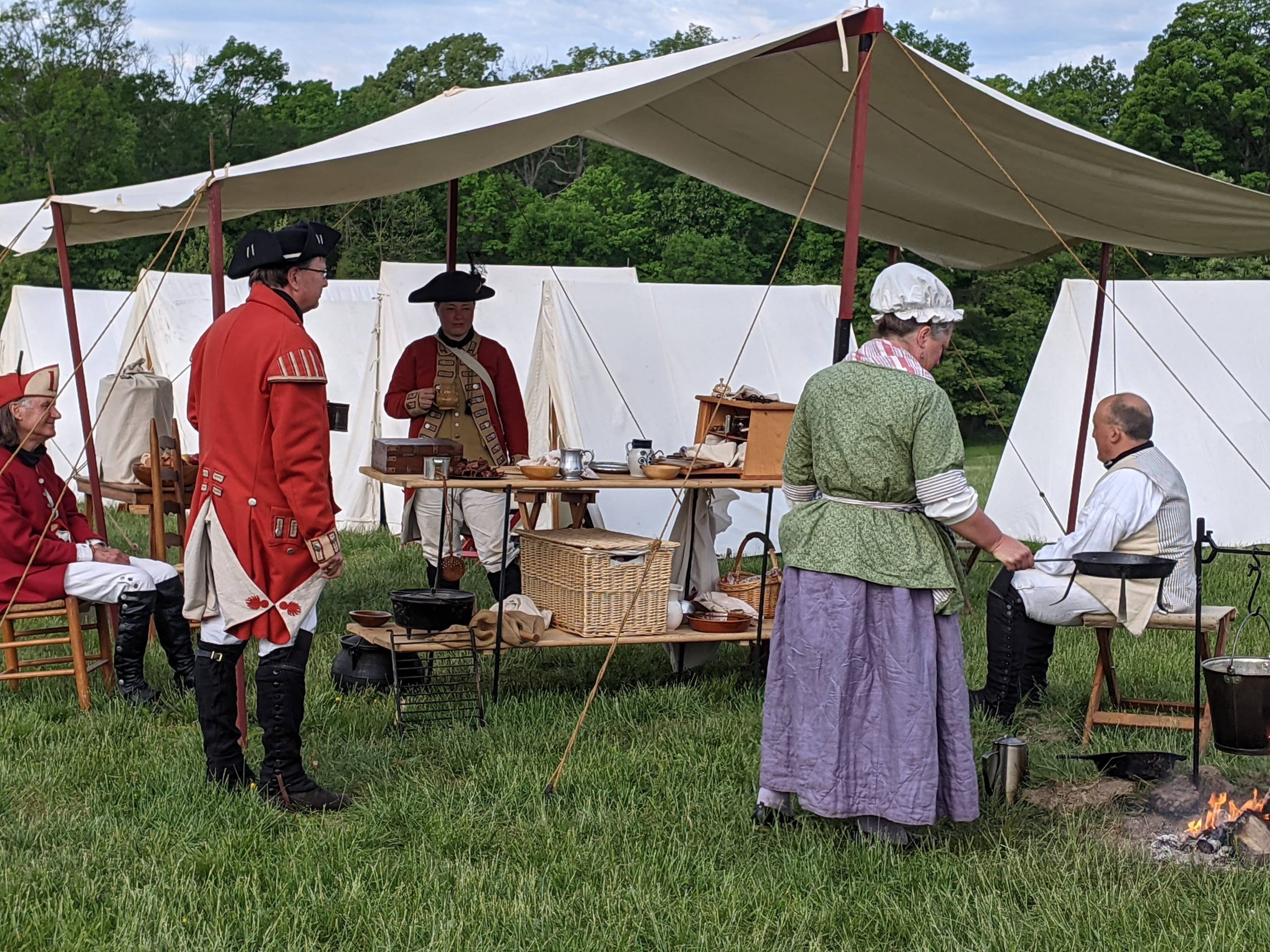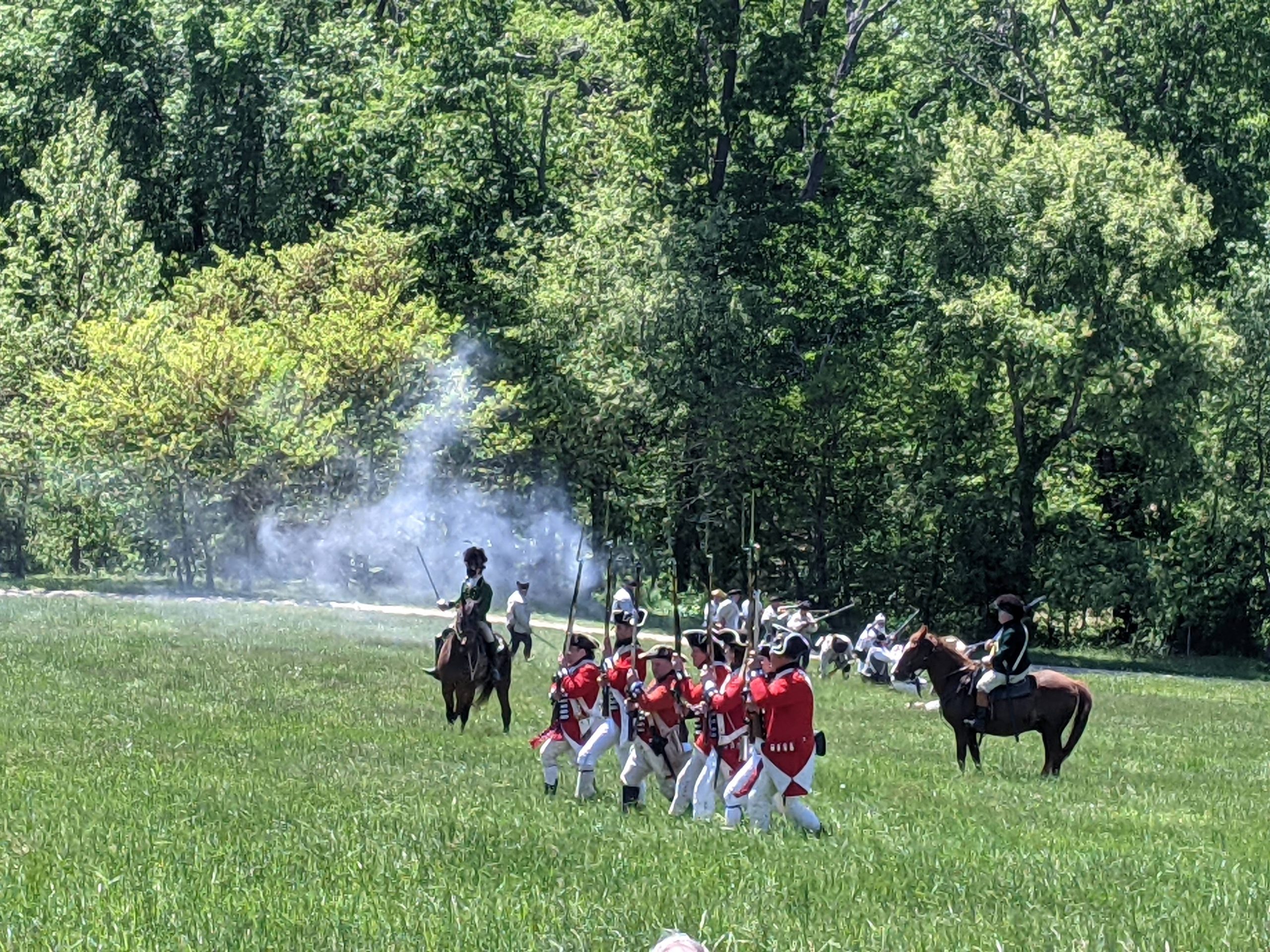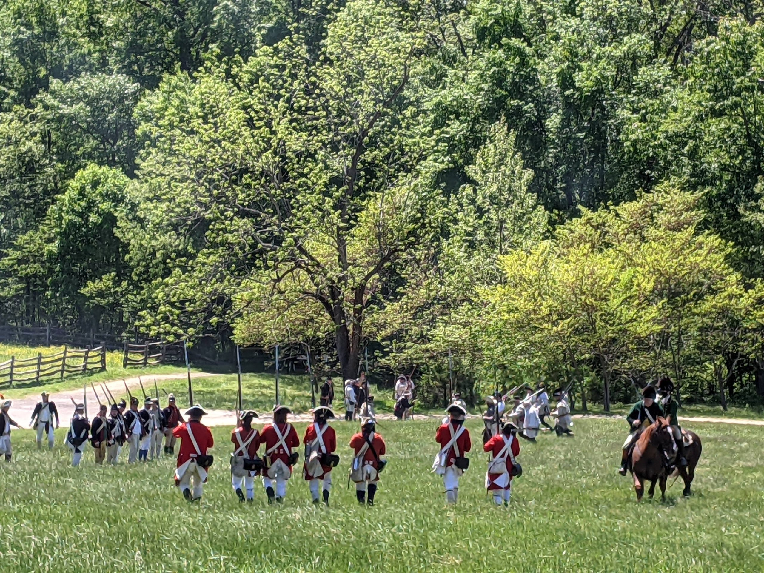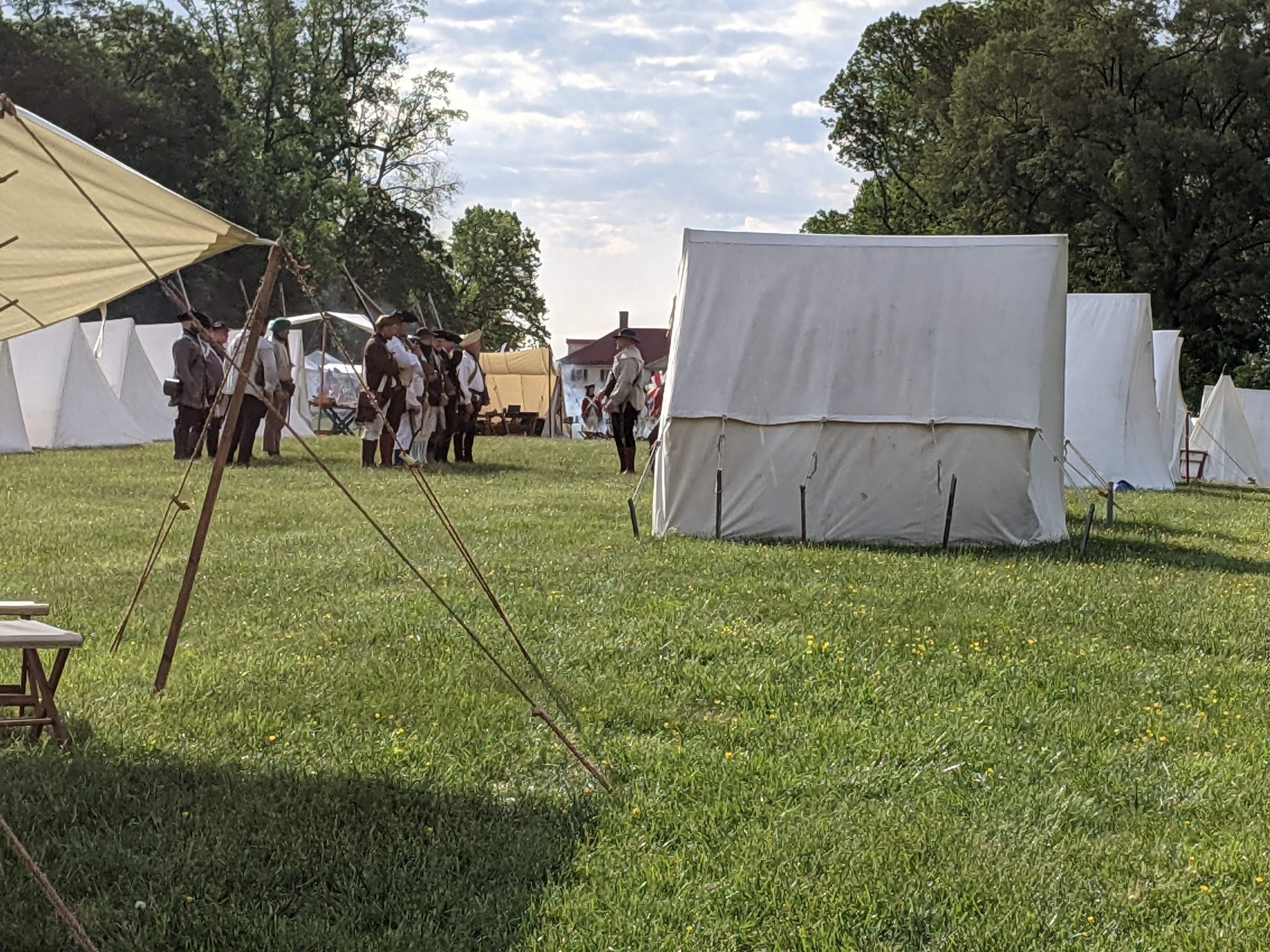 The Crown Forces contained two battalions. The 23rd was brigaded with the 1st New Jersey Volunteers and the (Hessian) Regiment von Hyun (Saturday only). Saturday morning both battalions rehearsed advancing by Indian files, open order, and passing through ranks. There were morning and afternoon scenarios on each day. Mr. Washington was present on the afternoon of each day, which implied a Crown Force defeat or retreat. Jay Weatherbee of the 1NJV commanded the battalion during the Saturday morning battle. The engagement went well and we drove the rebels with minimal resistance.