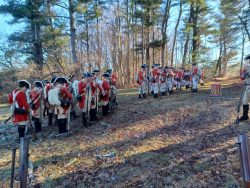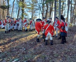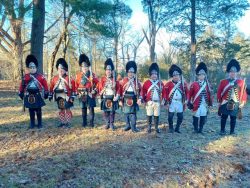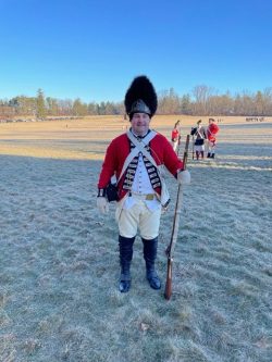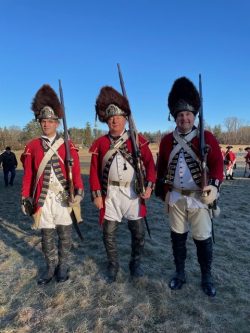 On Sunday, January 8th, a Northern Virginia detachment of Horsfall’s Company (Alex Ivanchishin, Jordon Rowland, and Denis Messier) traveled to Princeton Battlefield State Park in New Jersey to participate in a reenactment commemorating the 246th anniversary of the Battle of Princeton. Captain Ivanchishin (fielding as a grenadier private), Jordon, and Denis brigaded with Grenadiers from the 42nd Highlanders, anchoring the right flank of the British line. As was the case in January 1777, the rebels once again drove his Britannic Majesty’s forces from the field. The weather was bright and sunny with a light frost on the ground at daybreak. All told, it was great day to be on a portion of the actual battlefield. There was no camp for spectators to explore but there were plenty of opportunities to engage with the public after the battle. Many were curious about the bearskin caps, which gave us a chance not only to pose for photos but also to discuss the differences in function, uniforms, and equipment between the Grenadier companies and the battalion companies represented on the day.