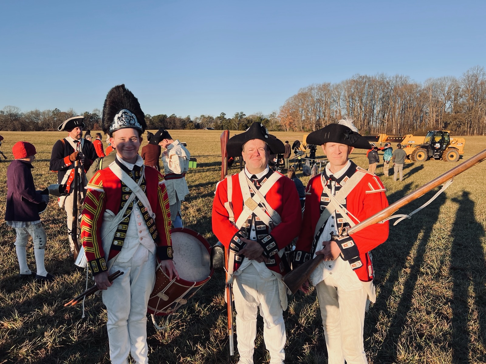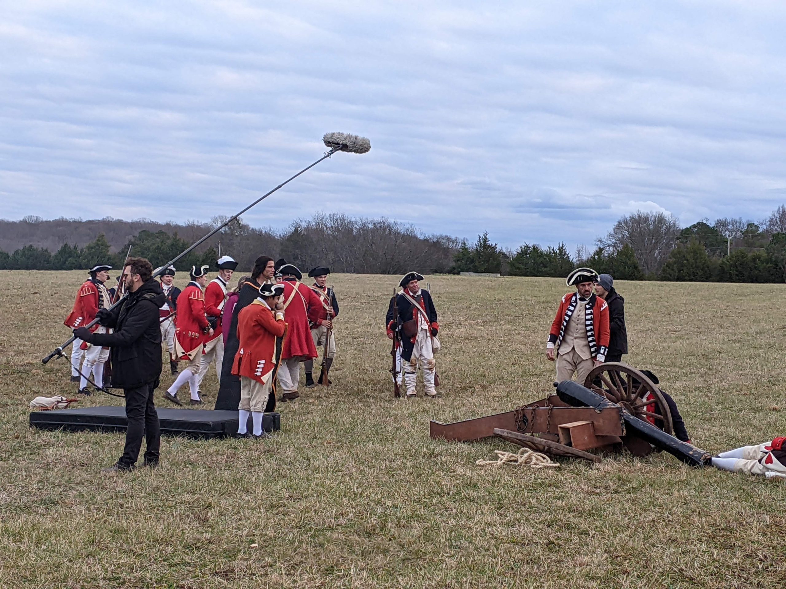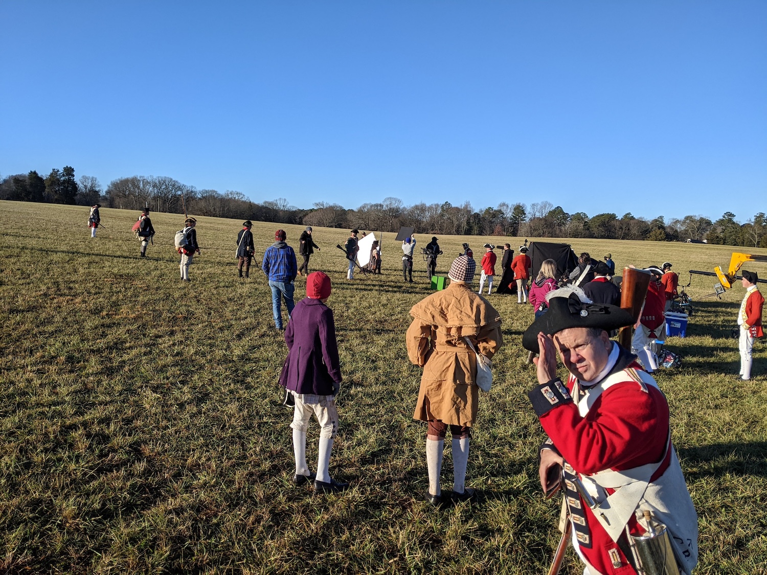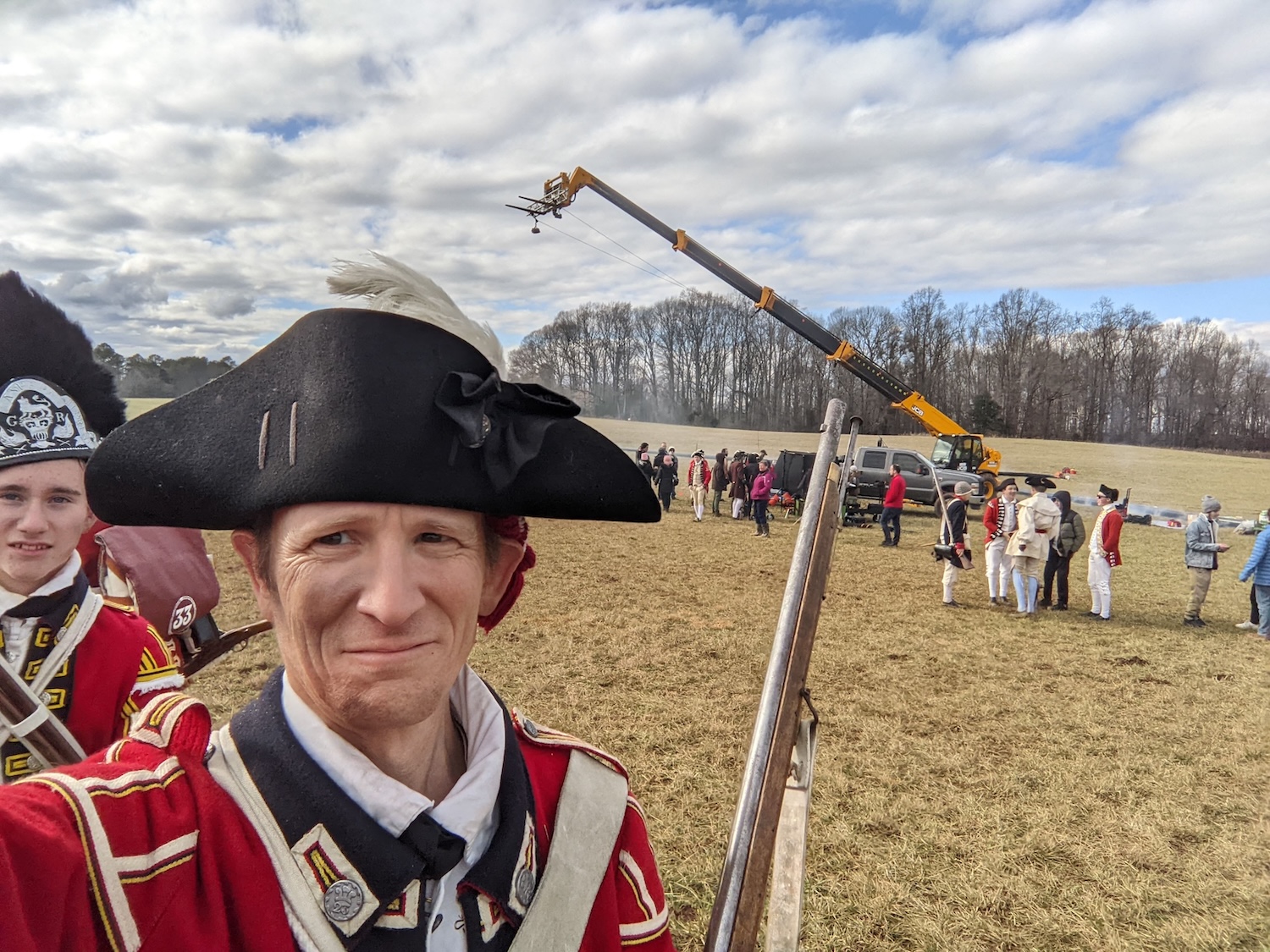 On Friday, January 13 members of the recreated 23rd Foot (Eric, Jon, Graeme, Kevin, Nolan and Tim) took part as extras in the filming of “LUSO” (https://lusotheseries.com/), the pilot program of a Revolutionary War era TV show to be streamed on the Angel Network. We spent the day running to and fro across a muddy field to recreate scenes from the Battle of Camden. Tim sacrificed his groin muscle in defense of King George’s honor! It was windy and cold, but fun was had by all as we got to see the behind the scenes work that goes into filming an “epic” motion picture.