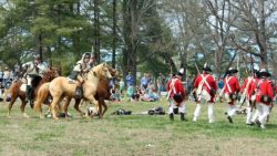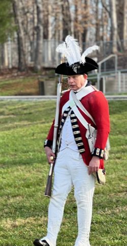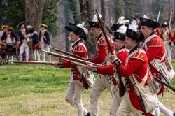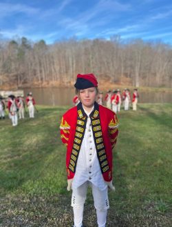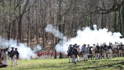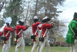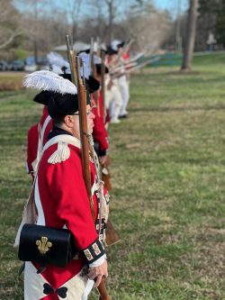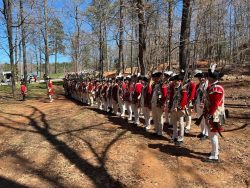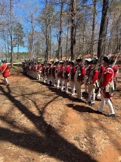 After lunch, the Regiment marched out with a very large and impressive British force to the battle staging area for the battle of Guilford Courthouse set to begin at 2pm. We moved up a hill to the crest – there we engaged the first line of the Continentals. Fusilier Gabe Everman shot his first round out of his new musket on the first volley.