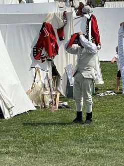 During the first battle, we manned the redoubt in bearskin caps. We, quite sensibly, switched to cocked hats for the remainder of the weekend after this sweaty first engagement. It is no surprise, therefore, that the regiment’s grenadier and fusilier caps went into storage while on campaign in North America. Otherwise, our dress consisted of breeches and half-gaiters, with bayonets worn around the waist. In terms of dress, the BAR specifically invited units to “come as you are,” with any approved kit authorized for wear. There was a wide variety of kit on display for visitors: Highland regiments in kilts, loyalist rangers, native allies in Indian dress, light infantry and grenadiers in their distinctive caps, and of course the American forces, who always seem to embrace the “come as you are” attitude with respect to their dress!